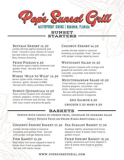 Pop's Sunset Grill is a popular restaurant located on the waterfront in Nokomis, Florida. The menu at Pop's Sunset Grill features a variety of seafood dishes, as well as burgers, salads, and appetizers.